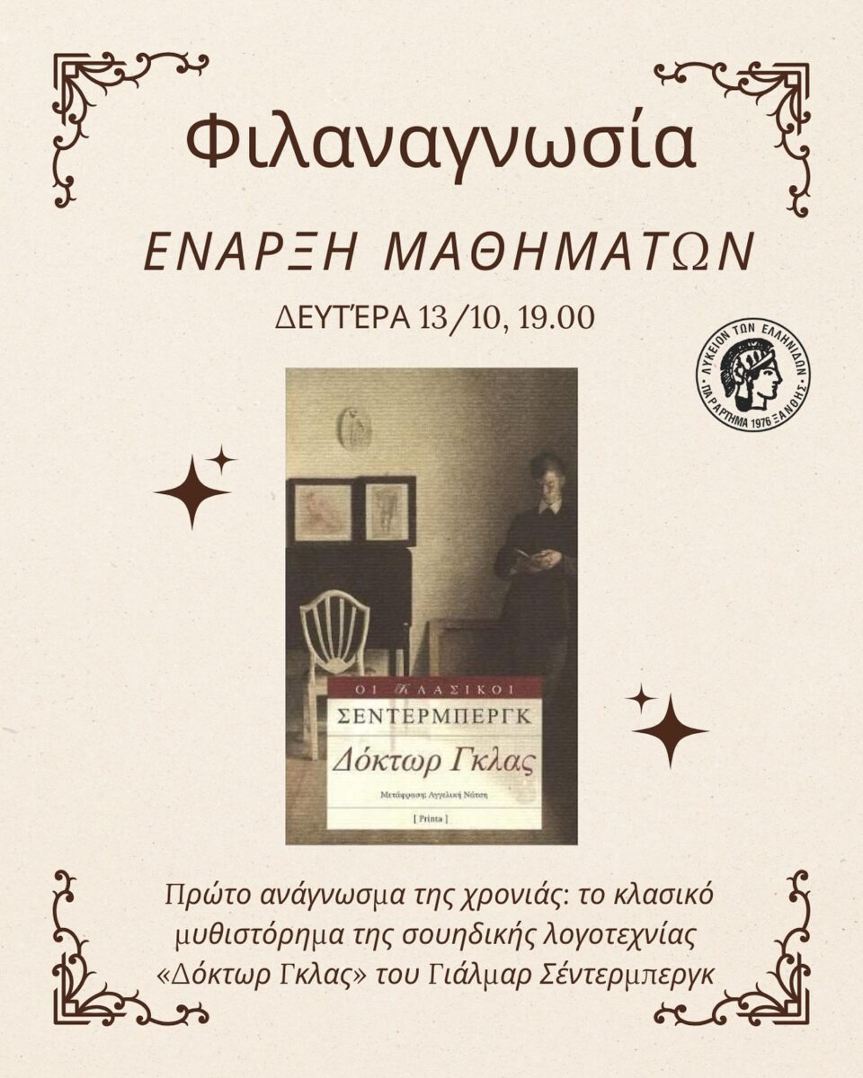 Το Τμήμα Φιλαναγνωσίας του Λ.Ε.Ξ. στο πλαίσιο της προσέγγισης έργων της παγκόσμιας και ελληνικής λογοτεχνίας ξεκινά τις συναντήσεις του για τη νέα αναγνωστική χρονιά τη Δευτέρα, 13/10/24, και ώρα 19.00.