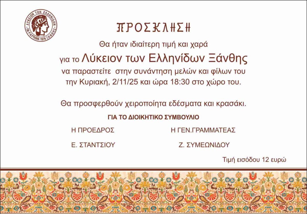 Θα ήταν τιμή και χαρά για το Λύκειον των Ελληνίδων Ξάνθης να παραστείτε στη συνάντηση μελών και φίλων του, την Κυριακή 2 Νοεμβρίου 2025 και ώρα 18.30 στο χώρο του. Θα προσφερθούν χειροποίητα εδέσματα και κρασάκι.