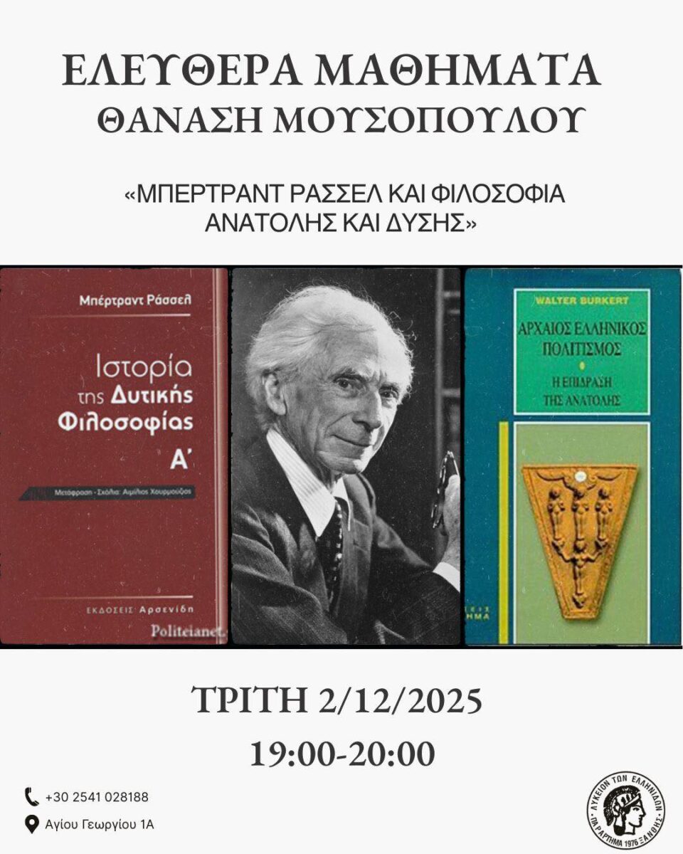 Θα παρουσιάσουμε τον Bertrand Russell (1872-1970) και το περίφημο έργο του «Ιστορία της δυτικής φιλοσοφίας» (τόμοι 2) σε Μετάφραση – Σχόλια του Αιμίλιου Χουρμούζιου.