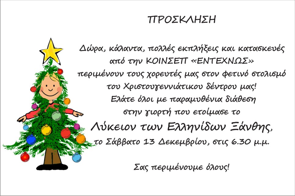 Δώρα, κάλαντα, πολλές εκπλήξεις και κατασκευές από την ΚΟΙΝΣΕΠ «ΕΝΤΕΧΝΩΣ» περιμένουν τους χορευτές μας στον φετινό στολισμό του Χριστουγεννιάτικου δέντρου μας! Ελάτε όλοι με παραμυθένια διάθεση στην γιορτή που ετοίμασε το Λύκειον των Ελληνίδων Ξάνθης, το Σάββατο 13 Δεκεμβρίου, στις 6.30 μ.μ.