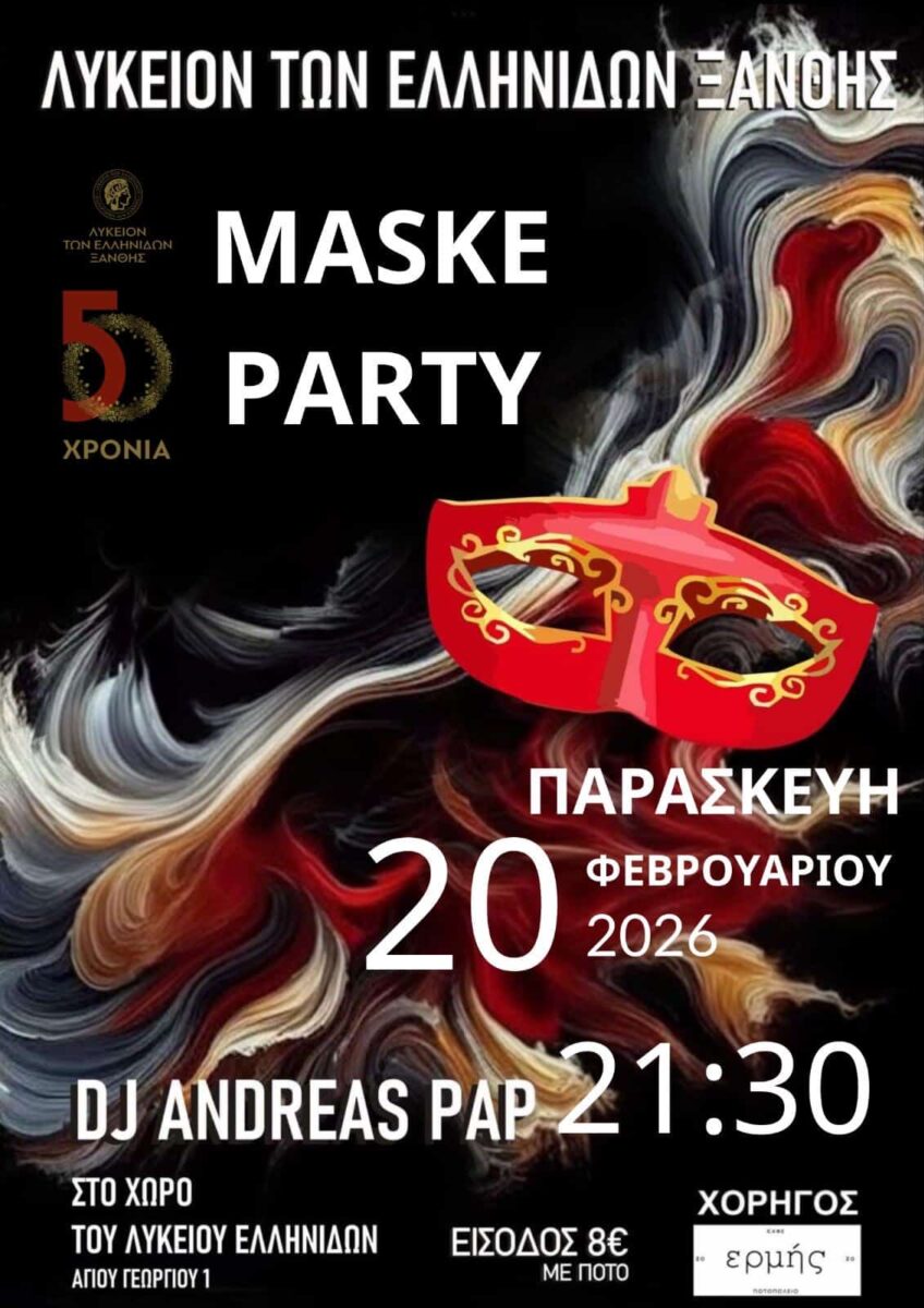 Το Λύκειον των Ελληνίδων Ξάνθης σας προσκαλεί στο καθιερωμένο Maskè Party της Φωτιάς, μια αποκριάτικη βραδιά γεμάτη μουσική, χορό και καλή διάθεση!
