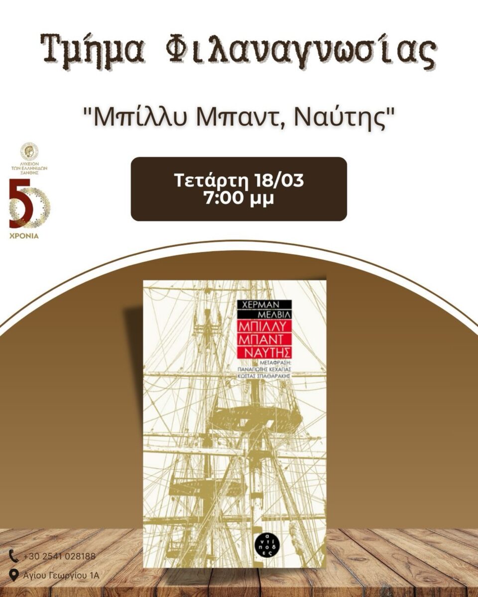 Στις 18 Μαρτίου, ημέρα Τετάρτη και ώρα 7:00 μμ στο τμήμα Φιλαναγνωσίας του Λυκείου των Ελληνίδων Ξάνθης συζητούμε τη νουβέλα «Μπίλλυ Μπαντ, Ναύτης» του μεγαλύτερου Αμερικανού συγγραφέα Χέρμαν Μέλβιλ (1819-1891) κατά τον 19ο αιώνα.