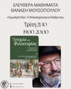 ΛΥΚΕΙΟΝ ΕΛΛΗΝΙΔΩΝ ΞΑΝΘΗΣ «Ουμπέρτο Έκο – Η Φιλοσοφία και οι Κλάδοι της» Τρίτη 21 Οκτωβρίου 2025, 7-8 μ.μ. Στον χώρο του Μουσείου Ιστορίας Ελληνικής Ενδυμασίας του Λ.Ε.Ξ. (Αγ. Γεωργίου 1, 1ος όροφος) Η φιλοσοφία, ως γνωστόν, παίζει ένα διπλό ρόλο: από τη μία μεριά συνενώνοντας τις επιστήμες χαράζει ένα δρόμο προς την αλήθεια, από την …